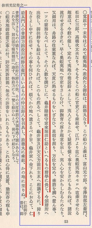 「先達而乗船え蝦夷測量御用不相勤候儀を御尋に付、海上測量は不得手之上、長々の 信濃守は忠敬に先だって(三月十七日江戸出帆 御舩政徳丸上乗)乗船しなかった理由を海上測量が不得手であること、長い船中が困ることなど申し開きをしている。そして、蝦夷地御用掛筆頭松平信濃守忠明が目指したのは海上航路のための天文測量であり、今後の船の通行のため、堀田仁助に測量を命じたにも拘わらず,帰路に乗船せず、陸路によったのは不埒な行為だとした。 我が国初めての沖乗りによる東蝦夷地直通航路開拓に成功した堀田仁助でしたが、彼のそんな事績は一部の人々にしか知られていないのが現状です。その理由はあの伊能忠敬否殊に彼の師天文方高橋至時の蝦夷地取締御用掛への積極的な根回しから、蝦夷地御用掛の面子を保つため失敗は許されない、至時自身のある目的を成功させるためにあらゆる手段を講じて事に当たった故、蝦夷地御用掛筆頭松平信濃守の一言で仁助の初の天文測量が航海と測量を利用した航路開拓はなかったものとされたからです。 御目付羽太正養は忠敬の記録により確かに同席していたにも拘らず、七年後に著わした「休明光記巻1」の整合性のなさは何の成せるわざか。 (4につづく) |