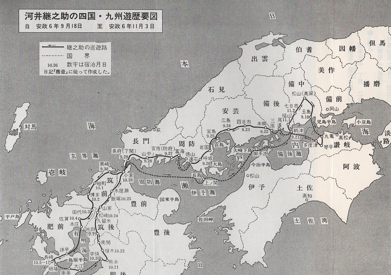河井継之助が宮島へ渡った十七年前の天保十三年に成る「厳島図絵巻之壱」に「・・・舊(もと)島號(しまよびな)は恩賀島(おんがしま)または御香島(おんがしま)、あるいは霧島、我島など称(い)へりという説あれど、さだかならず・・・云々」とあり、定かではないが「宮島」の島の呼び名は色々あったのです。継之助は、安政六年(一八五九)九月十八日備中松山を発ち、讃岐・備後・安芸・周防・長門・ 筑前・肥前・肥後・筑後・筑前・海路備後へと西方遊学で見聞を広め、十一月三日陸路備中松山へ帰着した。安芸の宮島には、鞆津・本郷・西条四日市・広島・草津から小船に乗って七日目の九月二十五日朝、宮島に立ち寄って、夜、周防へ船で発つまで滞在している。